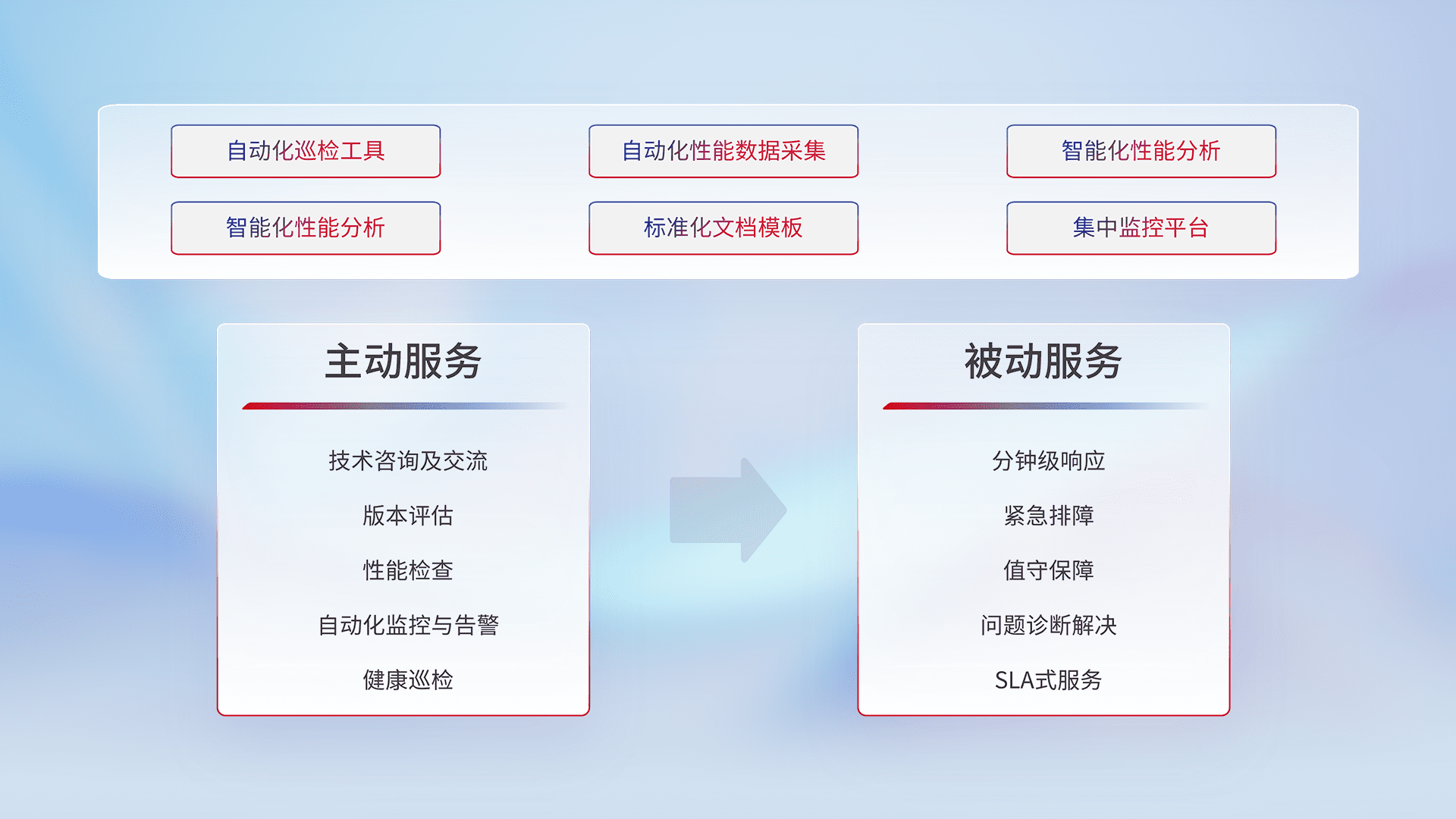 智能化工具和标准化文档,,保障服务质量,,提供主动服务(包含技术咨询、、、、版本评估、、、性能检查、、、、自动化监控与告警、、、、健康巡检)和被动服务包含(分钟级响应、、、、紧急排障、、、、值守保障、、、、问题诊断解决、、、、SLA服务)。。。。